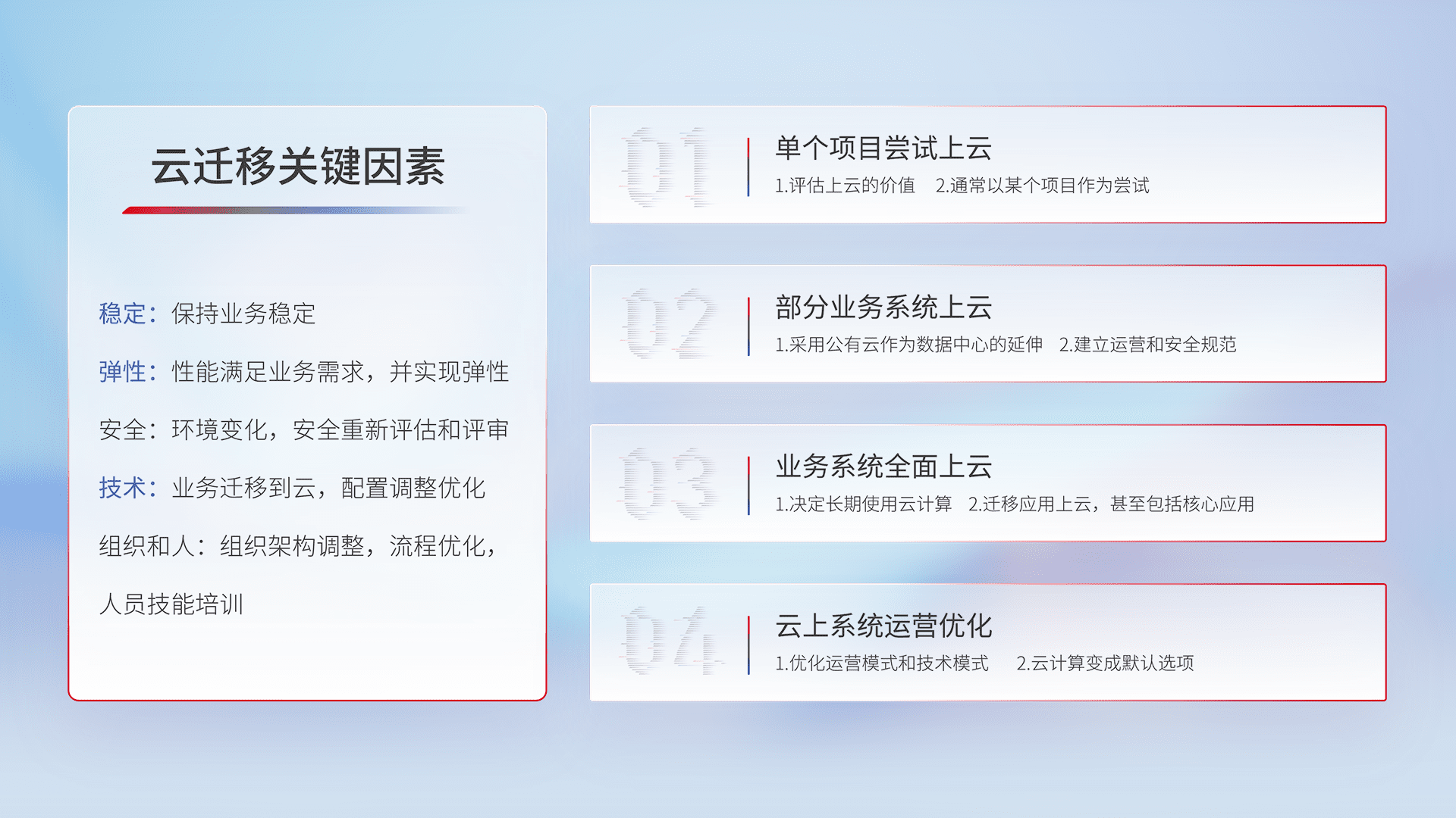结合实际业务,,,从规划设计、、、、云平台选型、、、、云原生改造、、、数据迁移、、集成交付,,,,迁移全过程为客户识别最佳上云路径,,做好风险识别管理,,设计网络架构、、身份权限、、安全审计合规、、、操作审计、、日志审计、、监控告警策略、、、多站点容灾设计等,,对云上基础设施进行整体规划,,提升IT治理水平,,以满足弹性、、、、高可用、、、、高性能的需求。。。。