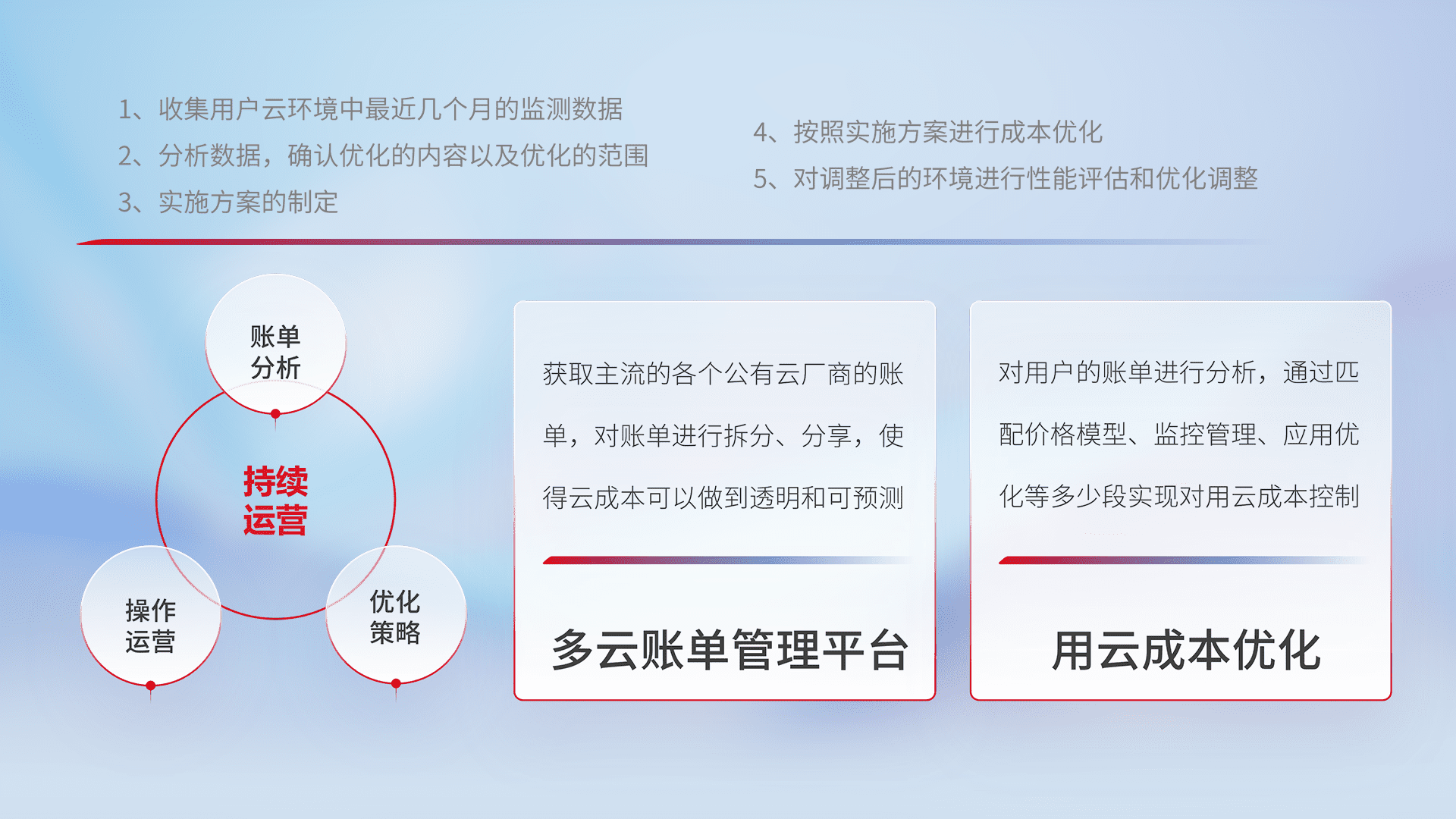 通过多云纳管,,,以统一的资源数据模型把客户的云资源进行抽象和封装,,进而实现对多云资源的统一操作,,保障云资源管理的可靠性、、、稳定性与可用性。。。。量身定制化运维内容,,配置、、开发运维、、补丁管理、、、、备份、、、、监控、、、认证和访问管理、、、审计和日常巡检等,,,保障在用云过程中的可靠度,,,,稳定度以及高可用率。。